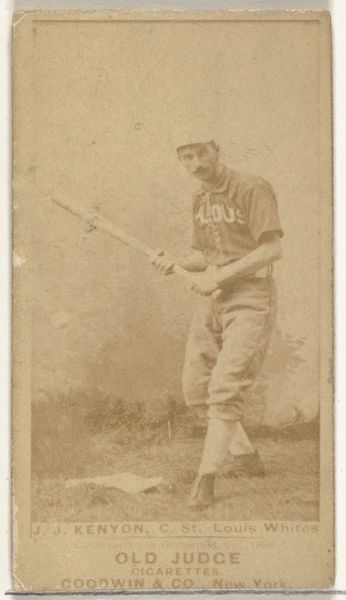 Curator: What a beautifully captured slice of Americana we have here! This gelatin silver print, dating back to 1888, features Francis John "Frank" Fennelly, a shortstop for Cincinnati. It’s part of the "Old Judge" series (N172), created by Goodwin & Company to promote their cigarettes. Editor: Immediately, the sepia tones pull me into the late 19th century, and the somewhat blurry details contribute to this nostalgic haze, but also soften what otherwise might have been a rigid portrait. His posture strikes me too; not heroic, but somehow thoughtful, expectant, almost melancholic. Curator: Interesting observation! If we break down the composition, Fennelly is centrally positioned, the baseball bat held almost tenderly in front of him, as though posing mid-practice rather than trying for a "grand shot." The photographic choices draw a specific emotion and sense of time. Look closely at the details like the slightly off-center cap and wispy moustache to pull you in. Editor: You're right; the elements contribute to the portrait’s inherent narrative and semiotics. The bat isn't just an object. Combined with the focused gaze, it reflects cultural shifts of industrial expansion, and newly structured leisure time centered around iconic sporting figures. Curator: These Old Judge cards offer a fascinating insight into how celebrity culture began intertwining with consumerism. Fennelly's inclusion in a series promoting cigarettes demonstrates that crossover of product advertisement and popular hero-worship, laying ground for modern consumer culture. It is hard not to feel touched that this specific player has become emblematic to the time. Editor: Absolutely. We might say the picture offers us a complex intersection of social history. His pose makes one contemplate not just an image, but evokes memory, the spirit of aspiration. Curator: And for the formalist in us both, the beauty of early photographic techniques meeting a burgeoning sports market feels genuinely magical—capturing history's essence in this modest gelatin-silver print. Editor: Yes, it provides us not only an antique baseball moment, but gives a way into grasping larger trends and shifting meanings.