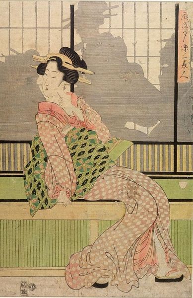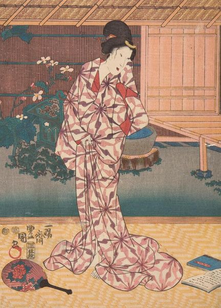 Editor: This triptych, "Scene from 'Rustic Genji'" by Utagawa Kunisada, showcases three figures in what appears to be traditional robes. The patterns are really striking, but I wonder what they signify? Curator: Indeed, the patterns and the setting are imbued with meaning. These garments, rendered in precise detail, echo social standing and perhaps even narrative cues from the Genji tale itself. Do you notice the objects scattered around them? Editor: Yes, a fan, a book... Are these symbols too? Curator: Absolutely. The fan might suggest a longing, while the book evokes learning and literature. These weren't just decorative elements; they were understood by the contemporary viewer as potent symbols. How do these symbols and visual cues speak to you? Editor: It feels like they are clues to understanding the characters' emotions and stories within this cultural context. Curator: Precisely. By understanding these symbols, we gain insight into the cultural memory and the emotions the artist wished to convey. Editor: I’ll definitely pay closer attention to the symbolism in art from now on. Curator: As will I. It’s fascinating to consider how symbols persist and evolve across cultures and time.