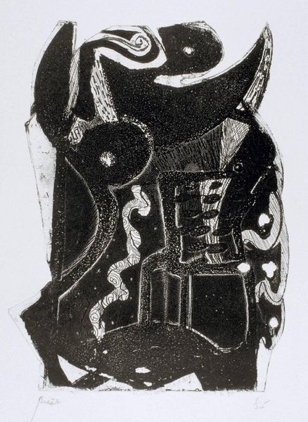 Editor: So, this is André Bicât's print, "Night Meeting," from sometime in the 20th century. It's a striking black and white image, very textural. I get a sense of hidden figures or maybe totems. What do you see in this piece? Curator: For me, it’s like peering into a dream. The abstract forms suggest a gathering, perhaps of spirits or memories. It's the kind of image that whispers secrets, isn't it? What secrets do you imagine it holds? Editor: That's beautiful. I'm not sure about secrets but the title makes more sense now. It's definitely evocative. Curator: Indeed! The night can be a place of meetings we aren’t even aware of.