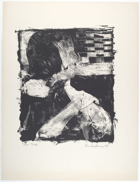 Curator: The somber mood is immediately palpable, isn't it? The starkness of the figure against the mottled ground—it evokes a profound sense of isolation. Editor: This is Zoran Music's "We Are Not the Last," held here at the Tate. Music, born in 1909, was a painter and printmaker known for his landscapes and later, haunting depictions of concentration camps. Curator: The roughness of the etching reinforces the subject; the marks themselves communicate trauma. Look at the head—so indistinct, almost erased. Editor: Music himself survived Dachau. This print speaks volumes about collective memory and the enduring impact of those experiences on identity and art. Curator: Note how the composition centers the figure, yet its incompleteness suggests a broader, less defined horror. Editor: It's a stark reminder of humanity's capacity for cruelty, but also, perhaps, a testament to survival. Curator: Ultimately, it's the interplay between the abstract and the figurative that makes this image so compelling. Editor: A chilling work that reminds us, indeed, that we are not the last.