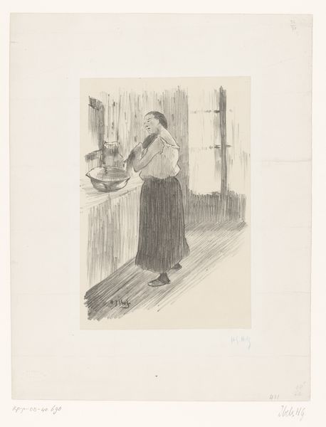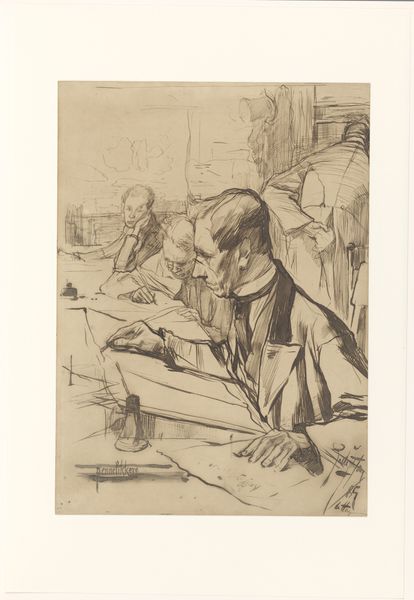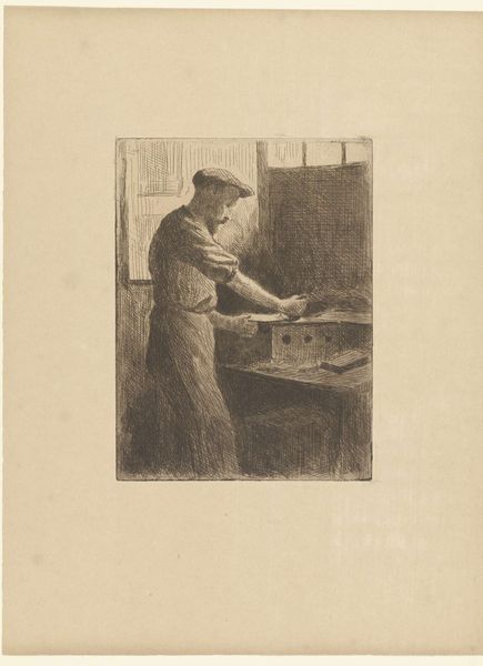 Editor: So, here we have Henri Boutet's "Drukker in zijn atelier," made around 1890. It's a print, probably an etching, showing a printer at work. It feels very… intimate, like a snapshot into a real moment. I wonder, what leaps out at you when you look at this? Curator: It’s funny, isn’t it, how a simple scene can feel so deeply personal? What strikes me is the palpable sense of routine, that daily grind kind of rhythm. You almost smell the ink and hear the clunk of the press, can’t you? Editor: Absolutely! It’s all in those details – the smoke from his cigarette curling up, the bowler hat perched jauntily on his head, the vague feeling of it being influenced by Ukiyo-e prints. Curator: Mmm, I wonder if Boutet knew those woodblock artists’ dedication to craft. It is lovely how a simple image, created with pen and ink, can imply an intimate exchange, a silent understanding of craft. Tell me, do you think it glamorizes work, or humanizes the printer? Editor: That's a tough one! I'm leaning towards humanizes. There's a certain dignity, but also a sense of the everyday struggle. Curator: Yes! Like he is caught somewhere in time. Editor: That’s lovely. Looking at it again, I notice a hint of caricature as well, that brings out the uniqueness of this craftsman. Curator: Well, I came in today just wanting to talk about color and now, after speaking with you, all I see are a thousand shades of grey in life as we learn to embrace the unexpected joy found within daily tasks. Editor: This was enlightening – made me look at this in a completely new light.