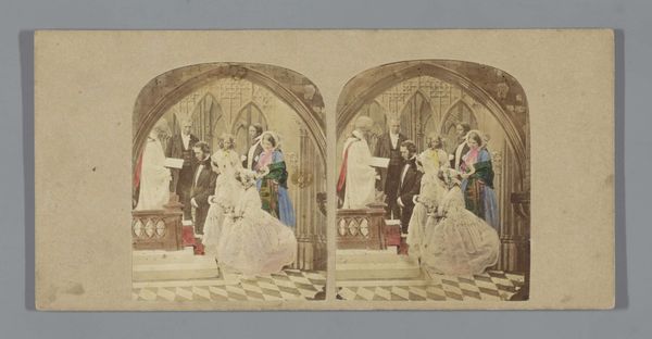 James Elliott’s stereoscopic image captures a church wedding, a tableau rich in symbolism and historical echoes. Central to the scene is the bride, veiled and adorned in white, a tradition that evolved from ancient Roman customs symbolizing purity and new beginnings. The ritual taking place, with the clergyman officiating, is a potent symbol of societal and divine sanction. The couple kneels, a posture of humility and supplication, mirroring similar gestures found in religious art across cultures. Think of the donors kneeling in Renaissance paintings, seeking grace. This act of kneeling resonates with deep psychological undertones. It speaks to our collective recognition of higher powers, both earthly and spiritual, and the desire for blessings upon this union. The church setting itself, with its arches and stained glass, evokes a sense of timelessness and continuity, a link to generations past who have sought solace and community within these walls. The symbolism isn't linear; it evolves, adapts, and resurfaces, reflecting our ever-changing relationship with tradition and modernity. It's a cultural echo that continues to resonate through time.