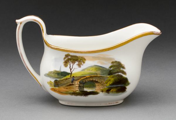 Curator: Isn’t this "Creamer" from the Derby Porcelain Manufactory simply charming? Made sometime between 1780 and 1795, it features delicately painted landscapes on porcelain. Editor: It gives me a sense of serenity—almost like holding a tiny landscape in your hand. There's something undeniably precious about it. The whole design, though…the Rococo style…feels inherently unequal. Curator: In what way? It seems idyllic. Editor: Consider its intended function. Fine porcelain like this speaks volumes about social status and access during that period. Tea-drinking itself became a ritual intertwined with colonial power structures. We have to remember how sugar and porcelain traveled from colonial contexts to become signifiers of refined society. Curator: True. I suppose I’m caught up in the artistry, the landscape painting—how it invites a moment of contemplation. I'm thinking of quiet mornings and a slower pace of life. The landscapes almost resemble miniature stage sets for tiny figures engaged in rural pursuits. Editor: Exactly, that’s the dream being sold. A curated picturesque life removed from the reality that produced it. We are seeing the commodification of leisure time when looking at a functional decorative art object like this. But maybe understanding that tension lets us appreciate the skill of the craftspeople even more acutely. Curator: Maybe. For me, I find the juxtaposition intriguing. It speaks to the duality of human existence. Beauty and art often rise from complicated and contradictory circumstances. Ultimately, though, the porcelain creamer seems to invite us to imagine possibilities and different landscapes, doesn’t it? Editor: I think I might appreciate my coffee a little differently tomorrow after considering all this!