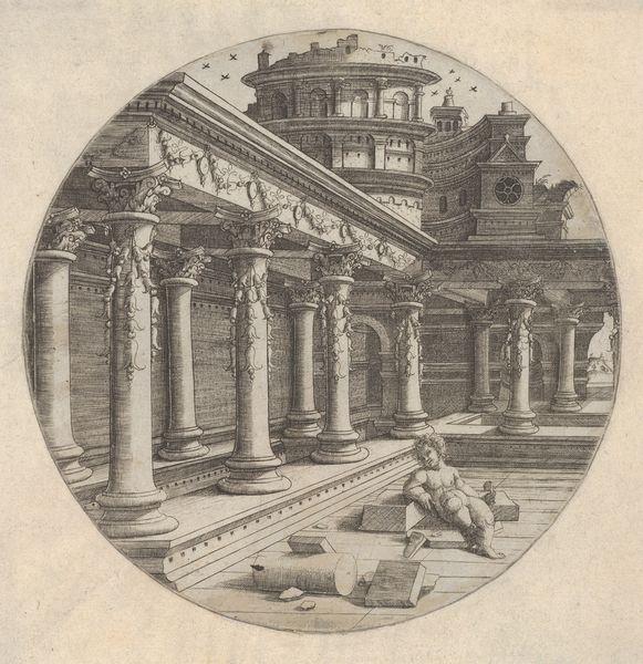 Jacques Androuet Du Cerceau created this engraving, “Perspectival View, Temple of Isis,” in the 16th century. During this time, a growing interest in classical antiquity influenced art and architecture. This print reflects the era’s fascination with ancient Roman structures, here reimagined as a temple dedicated to the Egyptian goddess Isis. Temples like these were places of spiritual encounter, but, here, the figures are instead preoccupied with earthly activities, appearing more as spectators or merchants within the grand space. The detailed architectural rendering, with its precise lines and calculated perspective, invites us to consider the intersection of power, religion, and commerce.