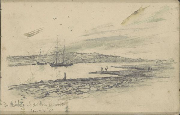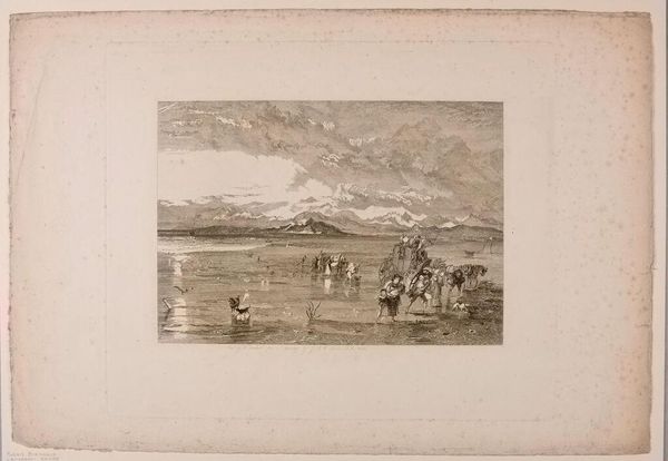Editor: This is Vilhelm Kyhn’s "Strandparti ved Frederikssund," an etching from 1849. It depicts a coastal scene with figures wading through shallow water. The mood is tranquil, but the labor involved in traversing the landscape seems very present. What stands out to you in this piece? Curator: I see more than just a tranquil landscape. Consider the context: 1849, a year of revolution across Europe, including Denmark. Kyhn's detailed depiction of everyday labor, like the figure carrying a heavy load across the tidal flats, gains resonance. It's not just a scene, it’s about class and their physical connection to the land. What does their labor represent during this politically fraught time? Editor: That’s interesting! I hadn't considered the social commentary. I was focused on the composition and the use of light in an etching, but understanding the time period completely reframes it. The figure's burden now speaks to broader socio-economic disparities. Curator: Exactly. And note how this portrayal contrasts with typical romanticized landscapes that often excluded or idealized labor. This piece might be interpreted as a commentary on the plight of working people at a moment of social change. Who is represented in art and how, reflects on cultural values and beliefs about who matters. How does the artist elevate the unseen or underappreciated? Editor: So, it’s not just about pretty scenery; it's a statement? The etching's detail emphasizes the harsh realities of working-class life, a direct challenge to more polished and less critical portrayals. Curator: Precisely! Kyhn invites us to consider those whose lives and work were so enmeshed within the landscape, and the social and political implications of that connection. Editor: Wow, I’m never going to look at a landscape the same way again! This really opens up a way to think about art as embedded within culture and history. Curator: Indeed! Art, even a seemingly simple landscape, becomes a powerful lens through which to understand and critique the society that produced it.