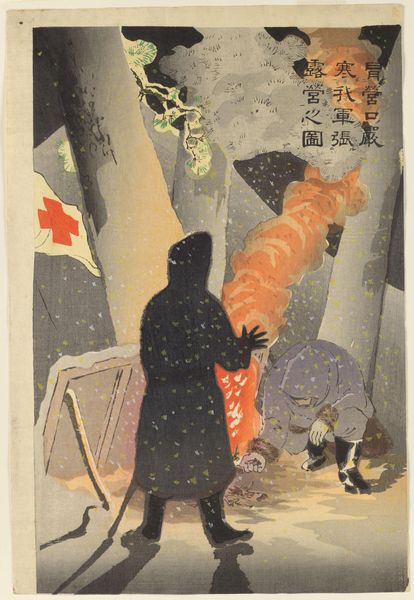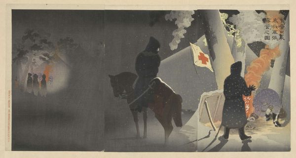 Editor: This is Kobayashi Kiyochika’s "Braving the Bitter Cold, Our Troops Set Up Camp at Yingkou," a triptych. I'm struck by how Kiyochika depicts the quiet resilience of the soldiers against such a harsh, snowy landscape. What underlying narratives do you see here? Curator: Well, let's consider the context. Kiyochika created this work during a time of intense nationalistic fervor in Japan. How might the romanticized depiction of soldiers, battling the elements, contribute to a specific political agenda? Editor: I guess it's not just a depiction of winter, but also a projection of strength and resolve. Curator: Exactly. And how does the inclusion of the Red Cross flag play into this narrative? Is it purely humanitarian, or does it also serve to legitimize the military campaign and assert a certain moral high ground? Editor: That's a good point. It definitely complicates the image, adding another layer to how the war is being framed. Curator: Indeed. The image becomes not just a snapshot of a moment, but a carefully constructed statement about Japan's role on the world stage, and the complexities of wartime identity. It’s important to question these constructed narratives.