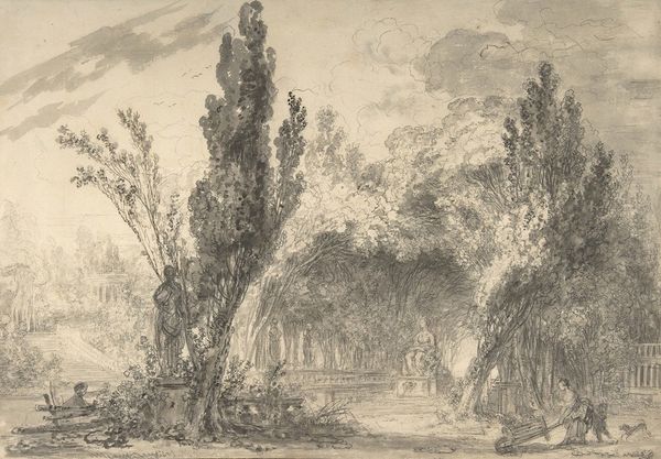 Curator: This is Thomas Gainsborough's "Village Scene with Figures," currently housed in the Tate Collections. The artwork's date remains unknown, but it provides some clues about the 18th-century English countryside. Editor: It feels incredibly dreamlike and a bit haunting, doesn't it? Almost like a memory fading at the edges. Curator: Exactly! Gainsborough’s handling of the chalk medium—its powdery texture and muted tones—evokes a kind of nostalgic reverie. One can imagine the labor inherent in the production of chalk and paper, common yet critical materials. Editor: I wonder about his choice to render such a potentially bucolic scene in such somber tones. Was it an intentional comment on the realities of village life, the social and economic structures at play? Curator: Perhaps. Or maybe it reflects Gainsborough's own romantic spirit, seeking beauty even in the mundane. I find that the chalk lends a certain ethereal quality, a sense of timelessness. Editor: I suppose it's that tension between the earthly materials and the otherworldliness that makes it so captivating. Curator: Precisely. It invites us to consider how something so grounded can evoke such profound emotion. Editor: It's a reminder that even humble materials can carry great artistic weight.