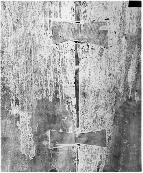 Editor: This is an X-radiograph of Titian's "Adoration of the Magi" from the Harvard Art Museums. It’s… unexpectedly abstract. It seems to focus less on the image, and more on the canvas. What insights can we glean from this alternative perspective? Curator: The radiography reveals the painting’s support and underlayers, highlighting the physical processes of its creation. We can see the artist’s labor, the choices made and reworked. The materiality demystifies the image itself, no? Editor: Absolutely. I’m struck by how this reveals the tangible effort behind a masterpiece. Curator: Indeed, it emphasizes the materials, labor and production often hidden beneath the surface of art history. This recontextualizes our understanding of artistic creation. Editor: I hadn't considered that. Thanks for pointing that out. Curator: My pleasure.