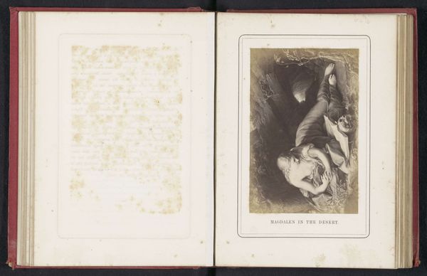 Curator: What we're looking at here is a photographic reproduction of a painting of The Descent from the Cross by Julius Rotermund. The original likely predates this reproduction, which itself was created before 1864, and is attributed to Hanns Hanfstaengl. Editor: The high contrast immediately creates a dramatic tension. Note how the artist guides our eye—almost violently, one might say—through a descending diagonal line of grief. It’s masterful, really, despite being a reproduction. Curator: The image serves as a fascinating example of 19th-century art dissemination. Rotermund, a now lesser-known name, gained wider recognition through such photographic prints. These circulated, influencing artistic trends and shaping public taste. Editor: Observe how the chiaroscuro is employed here. The figures are lit with an almost theatrical flair, highlighting their sorrow. It directs our emotional response and certainly reinforces the intended piety of the image. The poses feel baroque. Curator: Baroque, exactly! One can assume that Rotermund aimed for that grandeur, tapping into familiar visual tropes to engage his audience. These photographs played a role in both preserving and democratizing access to such large-scale frescos, often only found within specific churches. Editor: Indeed. While the composition remains relatively unchanged from the original fresco—and we should take its present-day impact with some degree of caution given its mediated form—the black-and-white format enhances the sculptural quality of the figures. It emphasizes their weight and solidity, drawing you in. Curator: It also removes color. That subtraction makes me think of other engravings reproducing well-known color images during the period. So, the grayscale here transforms the work. What originally was probably meant as hyper-real, through the use of color, instead focuses the observer’s attention on form. Editor: A point well taken. Though this particular version is secondhand, viewing it makes you appreciate how image reproductions help determine what gets to matter in cultural memory and shapes how stories and messages resonate through art over time. Curator: Precisely. Examining how pieces were transmitted and viewed by varied groups exposes the intricacies behind aesthetic standards and how history is made. Editor: It all underscores the necessity to consider both what’s present and what's absent when deciphering its importance to culture.