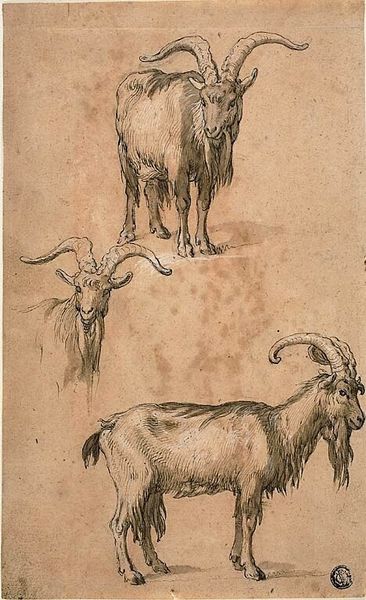 This drawing, "Vier koppen van schapen en bokken," was created by Barend Hendrik Thier. The artwork presents a quartet of animal heads with distinct expressions, rendered using subtle tonal variations. The structural composition of the artwork invites a semiotic reading, particularly in how the heads are arranged in a grid-like format. Each head is presented in a distinct pose. This organized layout encourages a comparative analysis. The visual elements such as the texture of the wool and the curvature of the horns, serve as signifiers, potentially reflecting the values of pastoral life during the artist's time. The choice of monochrome palette is not merely representational, but contributes to the overall impact of the artwork. It encourages us to view the animals not just as representations but as studies in form and texture. The artwork can be viewed as a site where nature is observed, analyzed, and categorized, reflecting the scientific curiosity of the era.