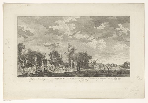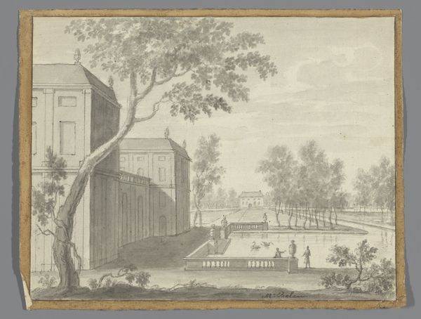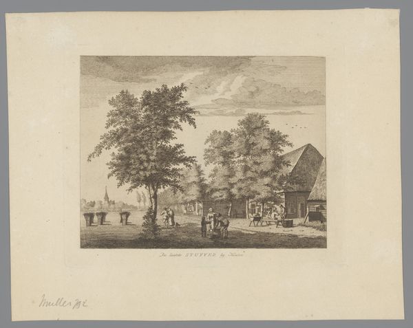 Editor: This is "View of Wijk bij Duurstede" by Nicolaas Wicart, created sometime between 1758 and 1815. It's an ink drawing on paper. It feels very serene, almost like a memory of a quieter time. What do you see in this piece? Curator: I see the Dutch landscape, not merely as a geographical space, but as a reflection of the Dutch identity being formed. The low horizon, the emphasis on the sky, the presence of windmills...These elements evoke a sense of perseverance and adaptation. Editor: Perseverance? Curator: The Dutch have a long history of managing water, of literally creating land where there was none. Windmills were crucial to that. They symbolize ingenuity and a constant struggle against the elements. Note how small the human figures are relative to the landscape itself; it’s symbolic. Editor: Ah, so it's not just a pretty picture, it's about the relationship between people and the environment. I hadn't thought of it that way. Are there other symbolic things happening? Curator: Consider the light. It's soft, diffused. Light often signifies enlightenment, or truth revealed. What “truth” might be hinted at here? Could it be the harmony – or perhaps the delicate balance – achieved through the industriousness of the Dutch people? Even something as humble as the smoke rising from the chimney speaks to home and hearth, and of a community persisting. Editor: So the landscape itself is a symbol. I’m so used to thinking of symbols as, like, mythological creatures. It’s interesting to see how everyday things can carry weight too. I will have to start observing with new eyes! Curator: Exactly. Symbols are everywhere, woven into the fabric of our world, waiting to be deciphered. This drawing offers a powerful glimpse into how a culture represents itself through its surroundings.