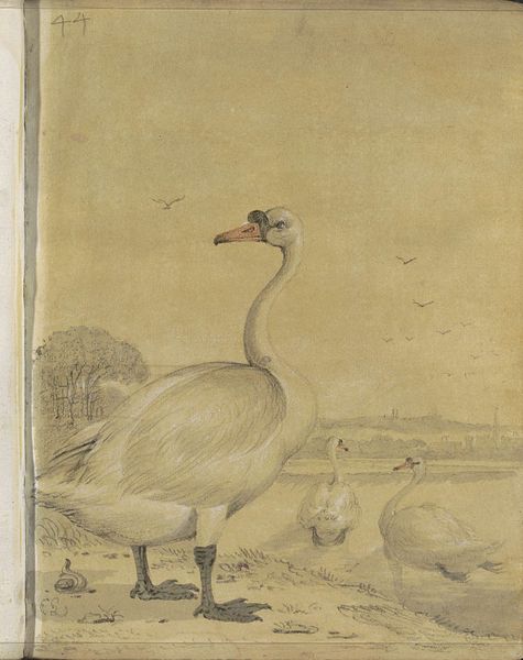 This print of 'De eendvogel,' or 'The Duck-Bird,' made by Gordinne, displays the image of a waterfowl through the art of lithography. The artist uses subtle variations in tone and texture to describe the bird's features and its natural setting. The composition balances a focus on the duck in the foreground with the gentle landscape elements of hills, water, and a distant building. The duck is centrally positioned, allowing the viewer to see its texture. The artist makes use of cross-hatching, short, and repetitive lines to suggest shadows, light and create a sense of dimension. The visual elements of the artwork operate within the context of structuralism, focusing on the interplay of form and meaning. It invites us to consider how the bird is presented not merely as an individual creature but as a signifier within the broader category of 'waterfowl,' which is then situated within a complex cultural and historical framework.