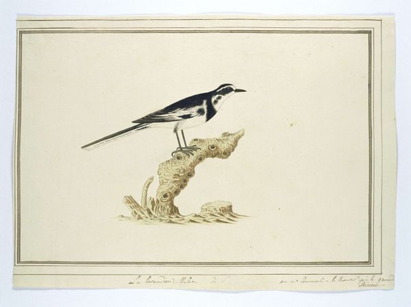 Editor: So here we have Robert Jacob Gordon's "Creatophora cinerea (Wattled starling)," likely made between 1777 and 1786. It's a watercolor drawing, and I’m immediately drawn to how detailed the bird's plumage is. What can you tell me about the artistic approach to this work? Curator: I see a direct representation of the bird, almost clinical in its depiction. Gordon focuses intently on the precise rendering of its physical characteristics using the watercolor medium. This work’s significance resides in how it connects artistic production with the practices of scientific documentation and colonial exploration. What kind of labor went into its making, from obtaining the materials to the artist's hand at work, to transporting such pieces? Editor: That makes me wonder about the social context then... Was this commissioned, or part of a larger scientific study? Curator: Good questions. Examining the materials used – the source of the paper, the pigments in the watercolor – tells us about trade networks and the access Gordon had as an agent of the Dutch East India Company. He isn't just representing nature; he's transforming raw materials into a commodity, into knowledge itself, ready to be consumed and utilized back in Europe. This complicates our understanding, isn't it? Editor: Absolutely. It’s not just a pretty bird, it's a product of colonial systems, showing a transformation of natural resources and labor. That adds so many layers! Curator: Precisely! By tracing the production and consumption of artworks like these, we reveal a fascinating intersection of art, science, and power. Editor: Thanks! Now I see how materials and their origin reveal new layers of understanding.
