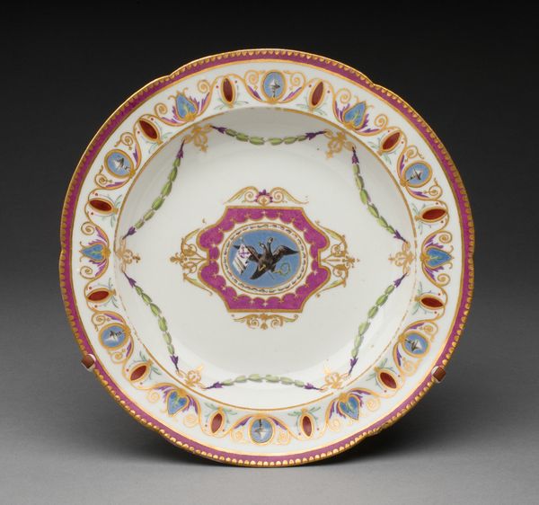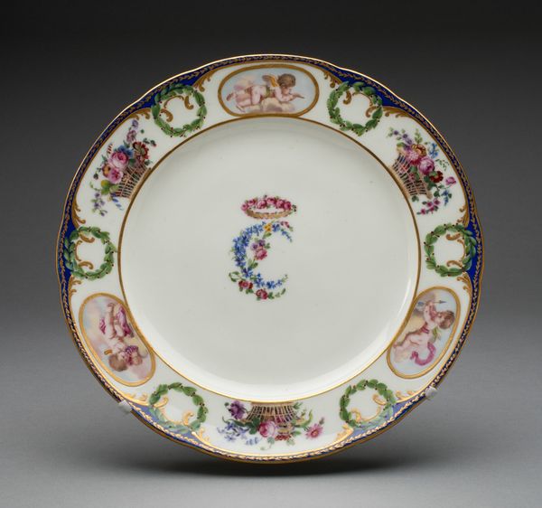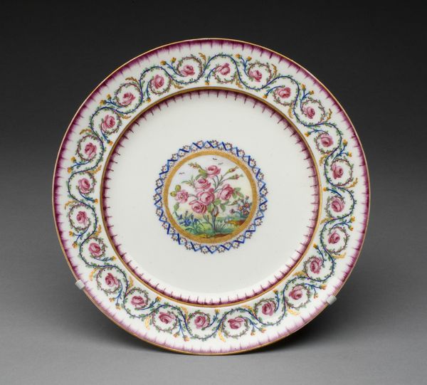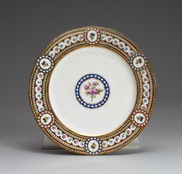 This plate was crafted by the Manufacture nationale de Sèvres. The piece is defined by its concentric composition, where the central rose motif sits within a bold blue circle. The eye is drawn to the interplay between the central rose and the radial symmetry of the border. The border is constructed with a subtle color scheme of soft green bands and red edges, decorated with an elegant arrangement of tiny floral details. The use of symmetry in the design creates balance and harmony. The plate destabilizes established meanings by presenting a utilitarian object as a canvas for meticulous artistry. Its structure is a reflection of a broader cultural engagement with luxury and refinement. The plate invites us to reconsider the categories of art and function, challenging the traditional hierarchy that separates the decorative from the fine arts.
