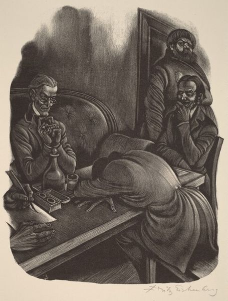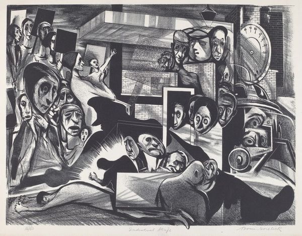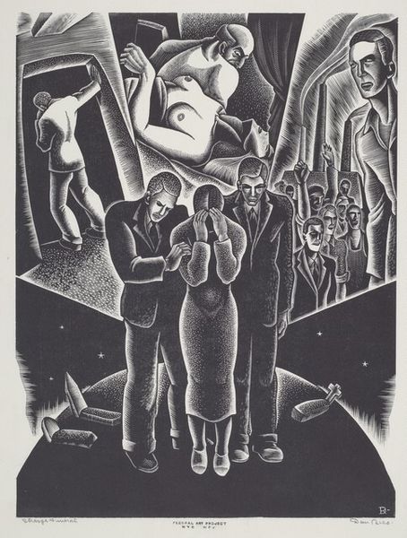 Editor: This is Solomon Judovin's "5 Vignettes" from 1933. It’s a woodcut print, and it strikes me as both haunting and intensely intimate. All these little snapshots, tightly packed… what do you see in this piece, beyond the surface narrative? Curator: Beyond? Well, sometimes the surface is all there is, isn’t it? But here... I sense Judovin wrestling with how to represent the world—not just depict it. Look at how he crams these scenes together. Each is rendered in that stark, unforgiving black and white of the woodcut, pressing against each other like memories in a crowded mind. What’s the unifying force, you think? Is it simply these glimpses into ordinary lives, or something darker? Editor: I feel a tension between the everyday – people walking down the street, sitting around a table – and this looming sense of… unease. Is that the Social Realism aspect coming through, do you think, filtered through the Expressionist style? Curator: Precisely. There's that wonderful dance. Social Realism aimed to show life as it *should* be, idealized, while German Expressionism ripped open the world to show how it *felt*. Judovin uses that raw emotionality to depict everyday life, giving it a weight, an importance, but also that… unrest you sensed. Editor: It’s almost like he's saying, “Here is the world, see its beauty and its burden, all at once." The high contrast makes the figures almost leap off the page, filled with emotion but at the same time, trapped in it. Curator: "Trapped." Yes. Like flies in amber, almost. Does it make you think differently about woodcut as a medium? It can be brutal, unforgiving. Is Judovin amplifying or subverting that brutality, you think? Editor: That’s something I definitely need to think about. It’s been fascinating exploring the layers within what initially seemed like simple vignettes. Curator: And for me too. Always great to see someone engaging so thoughtfully. Keep digging!