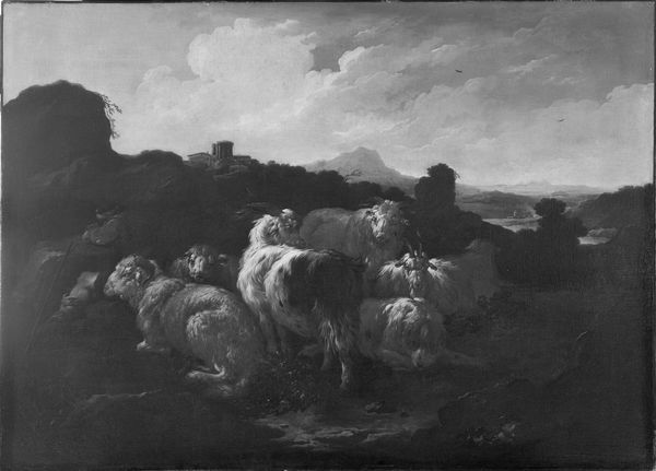 Philipp Peter Roos made this large painting of cattle, dog and shepherd in oil on canvas. Roos was interested in representing the inherent qualities of the animals he depicted, as well as their role in the agricultural economy. Look closely and you can see how Roos captured the texture and weight of the sheep's wool. The soft curls contrast with the rougher coat of the goats, creating a visual harmony that speaks to Roos's technical skill and artistic sensitivity. The painting's dark palette hints to the realities of rural life, a life of hard work outside. Roos has paid attention to the tools and skills needed to manage the flock, acknowledging those who labor on farms and the cycle of production.