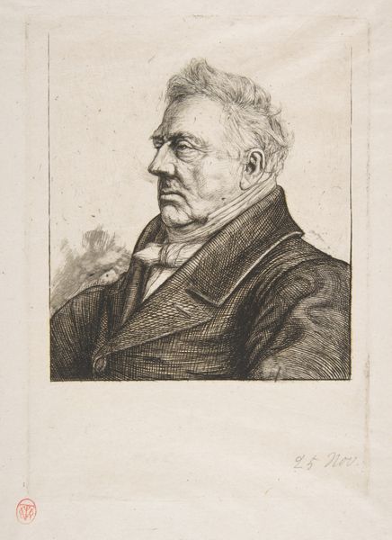 Moritz Calisch created this pencil drawing, "Portret van Christiaan Willem Marinus Klijn," which now resides in the Rijksmuseum. The portrait captivates with its delicate balance of light and shadow, achieved through subtle gradations of graphite. The subject's gaze is direct and engaging, framed by soft, diffused lines that model his face. The artist's touch is evident in the meticulous rendering of textures, from the smooth skin to the fabric of his coat, each conveyed through variations in line density and direction. Consider how the artist creates a sense of depth and volume using only pencil. This formal constraint forces us to confront the essence of representation: the translation of three-dimensional form onto a two-dimensional plane. Calisch's drawing exemplifies how line and tone can articulate not just the likeness of a person but also the subtle nuances of character.