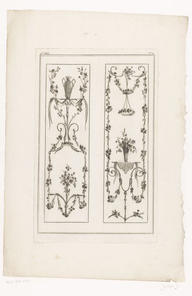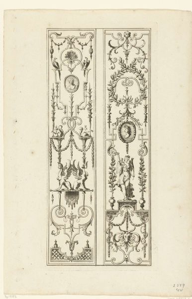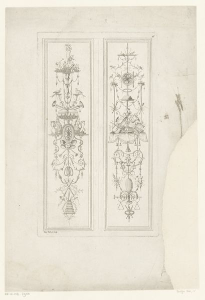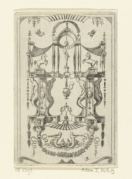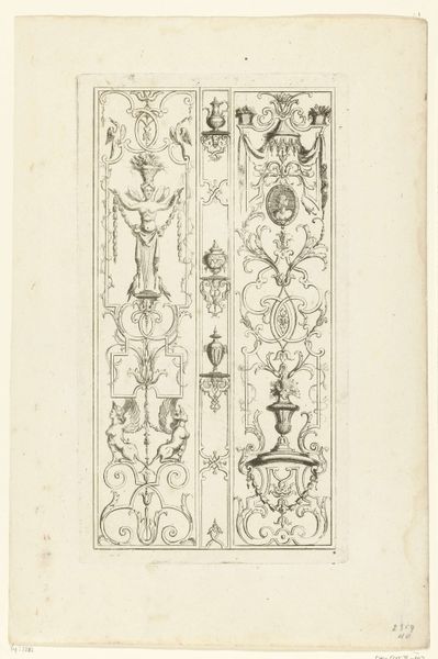 Editor: Here we have "Composities met obelisk en rookvat," dating roughly from 1686 to 1724. It's an engraving on metal and paper, currently held in the Rijksmuseum. The composition is strikingly symmetrical, yet it's filled with these whimsical baroque ornaments... it feels very ordered, but incredibly busy at the same time. What do you make of it? Curator: Indeed. Disregarding any symbolic weight for the moment, note how the artist has used line—specifically, the interplay of thick and thin—to articulate form. Observe the gradations that give depth to the obelisk and the suggestion of roundness to the figures. Editor: So you’re saying that it's less about what’s depicted and more about how it’s depicted? Curator: Precisely. Consider the arrangement of forms: the artist has created a sophisticated, almost architectural structure through these compositional choices. Symmetrical balance is obvious, but the subtle variations, like the different placements of the figures within each panel, prevents it from becoming monotonous. It asks us to dwell on formal relationships first. Editor: I see what you mean! I was getting lost in trying to figure out the scenes within each panel, but noticing the variations in line weight and the clever balance does make me appreciate the technical skill on display. Are there other structural elements I should be looking at? Curator: Consider the negative space. Where is it most effectively used? Does it highlight or diminish certain forms? And how does the print medium itself affect your perception of these formal relationships? Editor: That's a great perspective. It's like stripping away the layers of potential meaning and really honing in on the artist’s compositional technique. I guess I often overlook these things trying to dive straight into the symbolism! Curator: Exactly, and that's why returning to these core formal elements is so vital. We start to really *see* what the artist is doing.