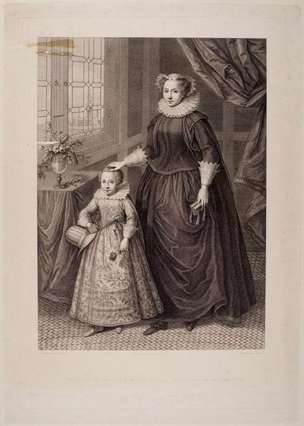 Editor: Moritz Steinla’s “Meyer Madonna” presents the Virgin Mary with the Christ Child, surrounded by figures. The whole scene feels very staged, and I'm curious, what symbolic elements stand out to you? Curator: Consider the composition itself. The figures are arranged almost as a pyramid, Mary at its apex, drawing our eye upward, signifying her elevated status. What emotions does this visual hierarchy evoke for you? Editor: A sense of reverence, definitely. And the figures flanking Mary seem to be of different classes, maybe? Curator: Precisely. They represent a cross-section of society, united in their devotion. The Virgin, crowned, cradling the sleeping Christ, is potent: she is both Queen of Heaven and nurturing mother. The sleeping child is a symbol of his mortality and future sacrifice. Editor: I hadn't considered the child's sleep as symbolic. Curator: These layered symbols create meaning that speaks to both the individual and collective human experience. It uses cultural memory to elicit complex psychological responses. Editor: It’s fascinating how much information is conveyed through these symbols.