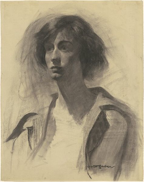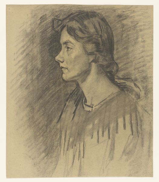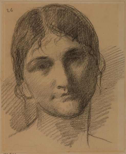 Curator: Here we have Edvard Munch’s portrait of Hjørdis Gierløff, currently residing at the Harvard Art Museums. The print work, in shades of warm sienna, gives an intimate glimpse of the sitter. What's your first impression? Editor: It feels...unfinished, raw. Like a fleeting thought captured on paper. The color is so earthy, it connects her to something ancient. Curator: Indeed. Munch often employed portraits to explore psychological states, and we can see how he used a seemingly simple technique to great effect. Notice how the shadows play on her face. Editor: There's this vulnerability, almost a melancholic weight to her gaze. It really draws you in. I wonder what stories those eyes could tell. Curator: Munch was known for capturing the anxiety of modern life. Perhaps that's reflected here as well. Editor: Absolutely. I hadn't initially picked up on the anxiety, but now that you mention it, there's a certain tension in the way she holds herself. It makes you wonder about the burdens she carries. Curator: It’s quite intriguing how Munch was able to capture a sense of psychological presence using a limited palette. Editor: A testament to his mastery, isn't it? A quiet intensity that speaks volumes. It makes you want to reach out and offer her some comfort.