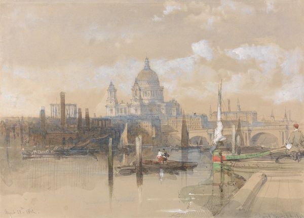 Editor: So here we have David Roberts's "View From Waterloo Bridge, Embracing St. Paul's, Somerset House and Temple," an oil painting capturing a bustling London cityscape. It feels both grand and industrial, doesn't it? What catches your eye most in this work? Curator: Well, let's think about the very *stuff* of this painting. Oil paint itself was becoming increasingly industrialized in the 19th century, shifting from artist-ground to commercially produced pigments. The scale of the canvas suggests not just a landscape, but the *material* progress reshaping London. Notice the factories’ smokestacks juxtaposed against St. Paul's – how might that be a statement about labor and production during this era? Editor: That’s a great point, I hadn't considered that contrast. So the placement of the factories almost hints at labor and industry challenging the church? Curator: Precisely. And what about the figures in the foreground? Consider them not as picturesque details, but as laborers connected to the river traffic. They are materially embedded in the urban landscape and support this emerging reality. This highlights class distinctions but also the importance of the workforce that made the expansion of the industrial era possible. The work also focuses less on who, and more on *how* the city changed. Editor: It’s fascinating how the focus on materials and production offers such a different reading! I guess I was drawn in more by the romantic style without seeing the impact that materiality makes to the artwork’s interpretation. Curator: Exactly. By thinking about materials, we uncover the connections between artistic expression, social transformation, and how a culture operates. It’s a reminder that art is as much about what it’s made of, as what it depicts.