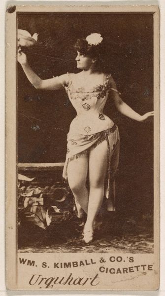 This photograph of Belle Urquhart was made by Allen and Ginter, as part of the Actors and Actresses series for Virginia Brights Cigarettes. It’s a small paper print, likely mass-produced using photographic techniques adapted to the printing press. The photograph is a direct product of its time, reflecting the rise of consumer culture and mass media. It was not created as a standalone work of art but as a collectible insert, a marketing tool designed to promote a brand of cigarettes. The image would have been one of many, churned out in large quantities, each copy a material testament to industrial efficiency and the commodification of celebrity. Consider the labor involved: from the photographers and printers to the factory workers who packaged these cards with tobacco, it encapsulates a network of production. It blurs boundaries between art, advertising, and everyday life, reminding us that all objects, even the most ephemeral, are embedded in social and economic systems.