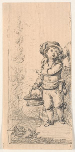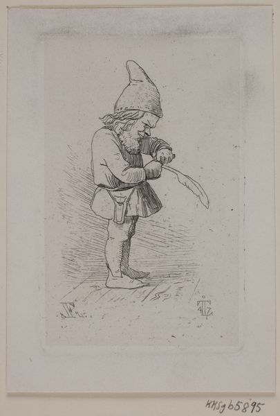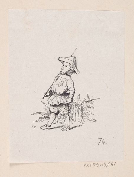 Editor: We're looking at an illustration for Hans Christian Andersen's "Ole Lukøie" by H.P. Hansen, made between 1870 and 1873. It's a drawing, probably an engraving or print. There's this rather serious little figure, loaded down with umbrellas. It's so simple, yet there's something haunting about his gaze. What catches your eye about it? Curator: Well, isn’t he a fascinating chap! He reminds me of a little merchant, weighed down by his wares. There's something so incredibly human in that slightly burdened look, you know? Makes me think of the weight of responsibility, even in childhood. Look at the precision of the lines; you can almost feel the weight of those umbrellas. They’re not just objects; they're like symbolic burdens, wouldn't you say? And that soft romantic light! Did you notice that he also looks a bit like a kid going off on an adventure? Maybe to Neverland! What does that do to your reading? Editor: That he could be going on an adventure, and he has so many useful tools, definitely warms up the image for me. It felt sad at first, but that new perspective shifts it a bit. What can you tell me about Romanticism and why this might be associated with that artistic style? Curator: Oh, Romanticism! It's all about feeling, intuition, and the power of imagination, rejecting rationalism of the Enlightenment. This little fellow, he embodies that spirit, doesn't he? Think about the fascination with childhood innocence, the longing for a simpler time, all captured in this little scene. It invites us to dream, doesn't it? Editor: Definitely. Seeing him as both burdened and on an adventure adds a lovely tension to it all. Thanks, I see so much more in this now! Curator: My pleasure! Sometimes, all it takes is a little nudge to unlock the hidden narratives. It certainly gave me something new to chew on as well!