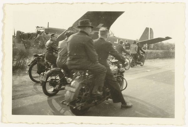 Curator: What strikes me immediately is the precarious tilt of the aircraft, how the ground seems to give way beneath it. There’s a tangible imbalance to the entire composition. Editor: Indeed. We're looking at a gelatin-silver print, possibly from 1934, titled "Mannen trekken de 'Uiver' uit de modder"—"Men Pulling the 'Uiver' from the Mud." This photographic print captures an anonymous moment related to the 'Uiver,' a famous KLM airplane. The setting is what seems to be a rural field. Curator: The immediate textural contrast is compelling: the sleek metallic body of the 'Uiver' against the yielding earth, and the bodies of the men like dark accents horizontally stacked like bricks, offering a study in geometries. It's all thrust, strain, and drag. Editor: Exactly. And thinking about those bodies: they aren’t a uniform mass; rather, each individual’s labor contributes to a collective effort. The very act of pulling becomes a shared experience of hardship. There is a democratic value to the plane ride and travel, if that mode of mobility brings strangers together and creates a collective goal like in this photograph. We might not have as many group efforts such as this one today. Curator: You highlight the material reality and communal labor. But notice also how the photographer’s eye positions us: we’re both observing this struggle and perhaps implicated in it, part of the crowd almost, sharing their visual perspective—it seems to challenge our idea of individual authorship. Editor: The choice of black and white strengthens that sense of collective memory, don’t you think? Black and white is the past and evokes distance with historical images. What would have happened if the photograph was in color? Curator: Perhaps the monochrome palette directs our gaze towards form, shadow, and line—removing a layer of contemporary interpretation—which lets us concentrate more on what constitutes its raw and intentional symbolism and significance. It allows viewers to read the historical narrative through formal attributes and their visual implications. Editor: Well, through materiality and technique, each in our own way, we’ve revealed various insights contained within this compelling image. Curator: Agreed; it’s in moments like this when the synthesis of perspectives allows one to experience something deeply.