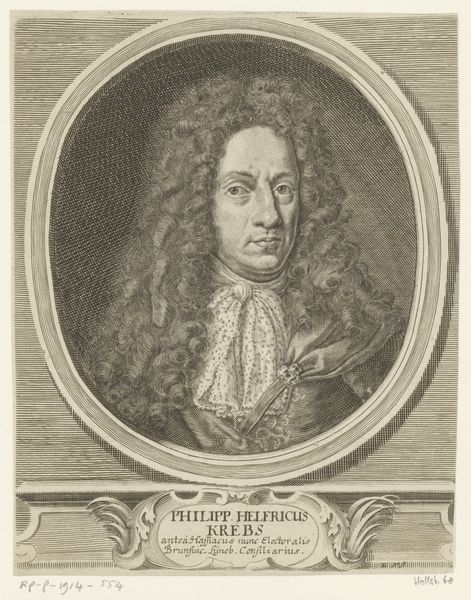 Curator: Here at the Rijksmuseum, we have "Portret van Cornelis de Witt," created between 1672 and 1731, crafted as an engraving by Pieter van Gunst. It captures a very stoic expression. What strikes you first about it? Editor: It's that tight circular frame, really. Makes it feel like peering through a historical keyhole. And there’s a somber quality to it. The lines are so precise, yet there’s this underlying weightiness in the sitter's gaze. Curator: It does have a serious mood. Van Gunst's use of the engraving technique is really remarkable here, allowing for incredible detail. Look at the intricacy of the lace collar and the rich textures he achieves with just lines. The whole thing whispers 'Dutch Golden Age.' Editor: Absolutely, it speaks to the era’s meticulous approach, a celebration of surface detail, if you will. Structurally, it's fascinating how the portrait within the oval contrasts with the rectangular inscription box below. A play of form for sure! I wonder what significance de Witt held at the time? Curator: De Witt was a significant political figure, a powerful, if ultimately tragic, statesman. Engravings like these played a crucial role in disseminating images of important figures, helping to shape public perception. Consider the inscription: "A Caesar in the field," so quite heroic indeed. Editor: So, we're seeing an effort to control the narrative through carefully constructed iconography. The formal realism combined with idealized inscription works as political theatre on paper. Do you think the portrait captures the "real" de Witt? Curator: Probably not entirely. It's an idealized representation, as you say. The engraving would likely smooth any imperfections, aiming for dignity and power rather than a raw, unfiltered likeness. What do you take away as you move on to the next piece? Editor: I leave pondering the relationship between public image and private identity and appreciating the formal skill, despite its propagandistic edge.