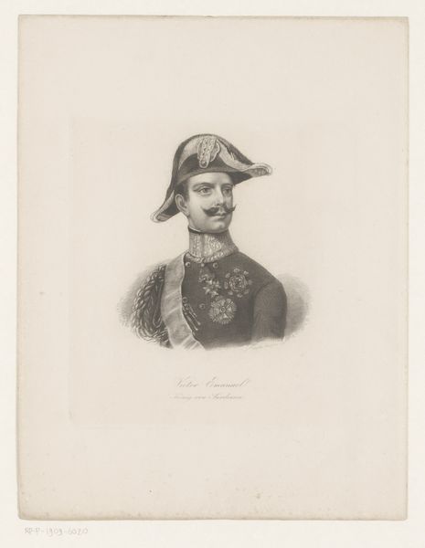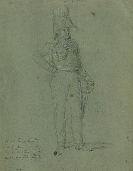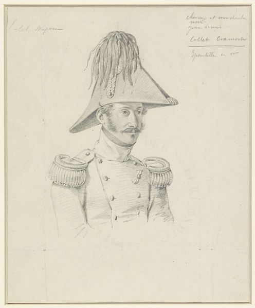 Curator: Here we have Jacob Joseph Eeckhout’s “Portret van Figuelmont,” a pencil drawing from the early to mid-1830s currently held in the Rijksmuseum collection. Editor: There’s a kind of vulnerable austerity to it, isn’t there? The light pencil work almost softens the severity of his military dress. Curator: Precisely. The drawing is an intriguing artifact of the era, depicting a man, likely an officer given the uniform and embellishments. The artist, Eeckhout, was well-regarded for his portraiture, moving within the higher circles of society at that time. The level of detail in the facial features is rather striking. Editor: Absolutely. But looking closer, it also exposes something of the power structures inherent in portraiture. Figuelmont is portrayed with a rather grandiose feather headdress. This speaks volumes about class and status and about the role of the military and military portraits in upholding certain ideals during that period. Curator: And note the inscription above the subject’s head indicating specific colours like ‘plume noir’ (black plume) – those annotations were perhaps meant for a future colourist working on a full painted rendering, so possibly the portrait served a functional, pre-production purpose. Editor: Right. Those added notes and textual directions further expose the labour behind images like these, the layers of work often unseen in finished works, reinforcing how images don’t arise in a vacuum but from a space where many are involved. What did military service mean for someone like him, for his community? I’m very curious about that context. Curator: That's a valuable perspective, highlighting the portrait as a staged representation with a political and social purpose, well beyond pure likeness. The inscription points towards artistic practices of the time and provides material context. Editor: It also offers a small point of access. As an activist, I want to leverage any access I can get into historical material and put pressure on these historical hegemonies, bringing social awareness to the forefront, making history speak to a more democratic present and future. Curator: And through that social awareness, art engages directly with the concerns of contemporary audiences, fostering civic dialogue and helping people reconsider dominant cultural narratives and beliefs. Editor: Precisely. This image, with its quiet and intense presence, provokes important discussion about hierarchy, about labour, about what it means to look and be looked at.