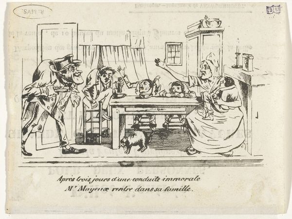 Curator: Welcome. We’re standing before Gesina ter Borch's "Kinderkamer met drie vrouwen en kinderen," a watercolor work from around 1660-1661, part of the Rijksmuseum's collection. It’s a Dutch Golden Age interior scene, depicting three women and several children. Editor: It's immediately striking. The delicate wash of the watercolor gives the scene a kind of ephemeral, dreamlike quality. You feel invited into a very private space. And that checkered floor really pops. Curator: Yes, the checkered floor provides a strong sense of perspective, grounding the scene, despite its almost ethereal rendering. Ter Borch was part of a very artistic family. Her brother Gerard, of course, was quite famous for his genre paintings. The work really encapsulates a lot of contemporary anxieties and fascinations around domestic life. Editor: And labor, don't forget the labor involved. Think about what's depicted – not just women idling away their hours but actively managing childcare. The watercolor itself would’ve been laborious. Every stroke, every pigment, is a record of her attention to materials. Look at the sheen of the doll carried on the left. That’s not just observation, it's transformation of raw material into art. Curator: It's interesting to consider this artwork within the broader context of Dutch genre painting during that period. Domestic interiors became increasingly popular subjects, reflecting a growing interest in the everyday lives of the burgeoning middle class, particularly in regards to gender roles and the importance of the family unit in Dutch society after the Eighty Years' War. Editor: I see how Ter Borch is challenging conventions by elevating everyday labor and imbuing it with an almost symbolic weight. She focuses on this intimate space in its almost messy actuality. A far cry from court portraiture, isn't it? What’s your take on this mirror over here? Curator: Mirrors frequently appear in Dutch paintings as symbols of vanity or self-awareness, prompting viewers to reflect. In this scene the role it occupies seems rather straightforward, without overt symbolism. Its inclusion also subtly invites the viewer into the room. We become active participants in the scene, as witnesses. Editor: Maybe so, or perhaps it serves to underline how material production and the conditions in which these things were viewed reflect cultural norms. These interiors and objects, the way people behave – were crafted to create desired responses. This isn’t merely an illustration, it's work shaped for social effect. Curator: Ultimately, it's a powerful, quiet depiction of domesticity, inviting us to consider the complexities of women's roles and the dynamics of family life in the 17th century, and even now. Editor: Indeed. Next time, I hope we dive deeper into her particular choices with pigments and her application techniques!