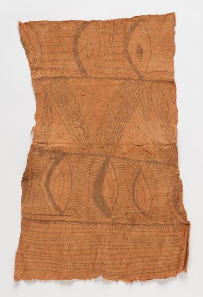 Mbuti men collect pieces of the inner layer of tree bark, soak them in water, and pound them until they are thin and pliable. Mbuti women then use twigs or their fingers to decorate these canvases with intricate designs that show repetitions of a single element or various groups of motifs. The Mbuti people live in the Ituri rainforest in the northeastern Democratic Republic of Congo, and the abstract imagery in their art expresses the shapes and motions of their natural environment. The barkcloth paintings can be seen as maps of the forest, invoking trails and webs, insects and animals, leaves and shelters. Yet these visual compositions also refer to the language of Mbuti music, characterized by syncope, free improvisation, and polyrhythm. As such, the painted barkcloths become graphic soundscapes, rendering a multitude of sonic events in conjunction with silence, captured by the paintings’ negative space.