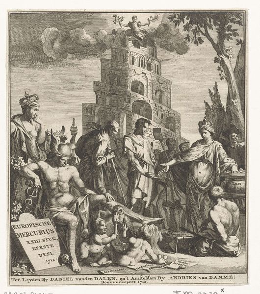 Curator: Let’s take a look at "Allegorie op Italië," an engraving made in 1761 by Jan Caspar Philips. The piece currently resides in the Rijksmuseum. What are your first impressions? Editor: My initial feeling is of density. The composition is incredibly packed; it’s hard to find a visual resting point. What catches my attention are the textural differences between the hard architectural elements and the soft, fleshy bodies of the putti. Curator: Texture is definitely key here. It’s Baroque allegory at its finest, replete with symbolic layers. Notice how the figure in the center, likely representing Italy, holds the key, the emblem of papal power, whilst surrounded by ruins but also architectural marvels. It's a land built on both history and faith. Editor: That pose reads to me as almost proprietorial. Who exactly was this made for? Given the "Te Amsterdam" inscription, was this print intended for consumption outside Italy? It feels like an outsider’s representation. How does Philips understand his role in the construction of the “idea” of Italy? The amount of detail here required immense labor in both its design and production. Curator: That is astute; images such as these carried enormous political weight, both in solidifying and shaping identity. See how regions like Genoa, Lucca, and Tuscany are all listed there; these engravings offered people tangible connections to these geographical ideas, even without physical presence. They served as reminders and affirmations of shared cultural identity across time and space, despite constant conflict. Editor: Absolutely. Consider the distribution too; engravings allowed for wider circulation. This image wouldn't simply hang as "art"; it was likely copied, traded, reinterpreted, all expanding Philips’ original labor beyond his workshop. I’m interested in that dissemination of this imagery into a consumer market. Curator: It's a compelling reminder of how art constructs our vision. The allegories woven into artworks serve as mirrors that reflect not just ourselves but also the grand narrative we have all chosen. Editor: Precisely! The hand that held the engraver’s tool helped to construct both vision and reality.