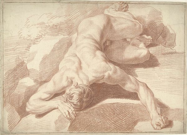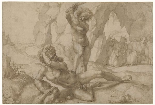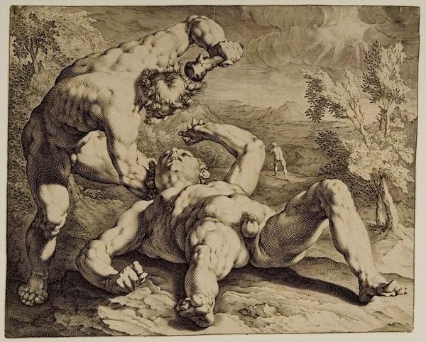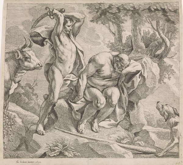 Theodoor van Thulden created this print, Blindmaking van Polyphemus, using engraving. The print presents a scene dominated by stark contrasts of light and shadow, where the figure of Polyphemus sprawls across the foreground, his body a study in muscular tension rendered through meticulous lines. We observe a dynamic interplay of forms. The jagged rocks and tormented body of the cyclops create a visual rhythm that is both violent and mesmerizing. This representation delves into the disruption of order through the act of blinding. Here, the play of light and shadow not only defines form but also accentuates the themes of blindness and insight. The chaotic composition underscores a broader existential inquiry into themes of vulnerability, retribution, and the collapse of established power structures. Consider how the formal elements of this print serve as a profound commentary on the human condition and the cyclical nature of power and suffering.