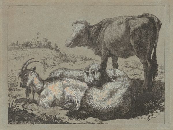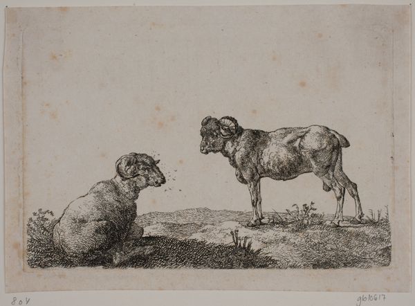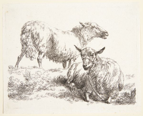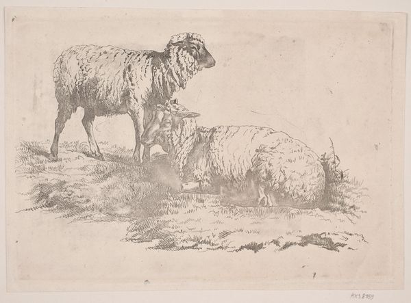 Curator: Up next we have "To får", meaning "Two Sheep", an engraving by Johannes Wilhelm Zillen, dating from 1857. Editor: Immediately, there’s a starkness to this image. The scene is rendered with fine lines, emphasizing the stillness and isolation of these sheep. It evokes a sense of quiet solitude, doesn't it? Curator: The precision of the line work is interesting; Zillen was very invested in using realism to represent aspects of rural life, specifically domestic animals. Sheep are, after all, highly symbolic within the Christian tradition. They represent gentleness and innocence. Do you see this echoed in the portrayal of the animals? Editor: I do, but there is a deeper political reading available as well. Given the period, the mid-19th century, one might argue that sheep, traditionally associated with pastoral care, could symbolize the exploited rural populace in the face of burgeoning industrialization. Their docility becomes less about innocence and more about vulnerability in the face of societal forces. Curator: An interesting, albeit pointed reading! I can definitely see that interpretation adding another dimension. Zillen's masterful strokes really draw you in, allowing one to consider the simple beauty of rural creatures and reflect on greater societal impacts on the everyman in society. Editor: I agree. It invites introspection about how seemingly simple images often hold deeper narratives, especially when considering their cultural moment and context. Curator: Absolutely. These sheep aren’t just sheep; they represent much more when placed in conversation with history and social issues. Editor: And it’s that multilayered interpretation that keeps the artwork so relevant, doesn’t it? Even almost two centuries later! Curator: Yes, exactly. What remains consistent are the psychological relationships people form with symbols and depictions of animals like this, something worth observing for those of us willing to look.