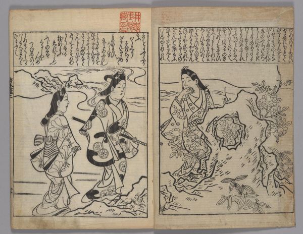Editor: This is a page from Hishikawa Moronobu’s “Illustrated Collection of Old Tales,” a woodblock print. It feels like a glimpse into a lively, perhaps chaotic, scene. What symbolic weight do you think these images carry? Curator: Notice how figures are arranged within defined spaces, perhaps representing societal roles. Do you see how the monkey's presence disrupts the order? It could symbolize the untamed aspects of human nature, a reminder that chaos always lurks beneath the surface of civilization. Editor: That's fascinating. So the monkey acts as a symbol of…disruption? Curator: Precisely. Think about the stories these images might be illustrating. What recurring themes about order, chaos, and human nature might they explore? Editor: I hadn't thought about it that way. Thank you!