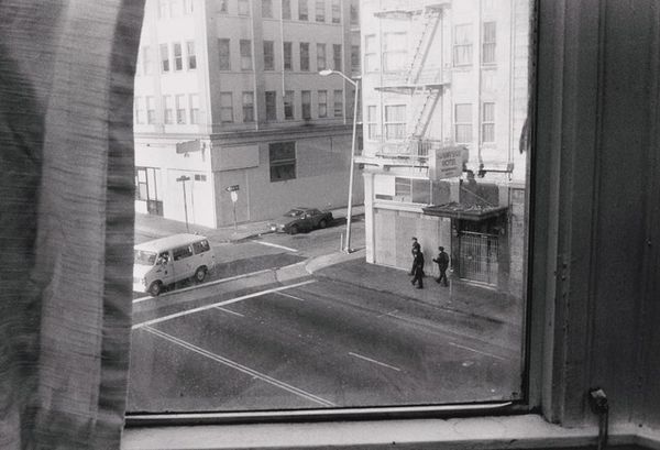 This photograph, “Sixth Street, San Francisco,” by Jim Goldberg, captures a stark street scene. The white lines of the crosswalk bisect the dark asphalt, drawing our eye to a lone figure walking across. This motif of the solitary wanderer, caught between lines, echoes through art history. Consider the figures in Edward Hopper's paintings, similarly isolated within urban landscapes, their presence a testament to the alienation of modern life. The crosswalk itself becomes a symbolic threshold, a space of transition and potential danger. The overhead perspective lends an air of detachment, as though we are observing from a removed, almost godlike vantage point. This echoes the tradition of aerial views in Renaissance painting, where the elevated perspective allowed for a comprehensive depiction of the world. Yet, here, there is no sense of mastery or control, only the stark reality of the street below. This photograph acts as a poignant reminder of our shared human condition, our individual journeys unfolding within the complex fabric of the city.