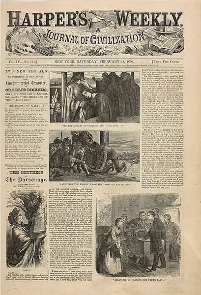 Curator: Winslow Homer's “Allow Me to Examine the Young Lady,” a print from 1860 originally appearing in Harper's Weekly, strikes a familiar Romantic chord, doesn't it? What do you make of this scene? Editor: It has an austere feel, primarily conveyed by the limited palette. The medium, an engraving, naturally lends itself to that, but also reinforces a feeling of control. You see it not only in the clean, precise lines, but the very deliberate staging. It's a fabricated tableau. Curator: Absolutely. And I'd argue the composition amplifies that staging. The men standing, looming even, behind the central figure creates an atmosphere laden with unspoken meaning. Do you feel any power dynamics are at play? Editor: Most definitely! This image points to the societal mechanisms—the material and symbolic pressures— brought to bear on women of this era. It shows how patriarchal structures impacted the very presentation and perception of the self. I can imagine that woman’s corset and the social confinement she would have likely faced. Curator: I agree, she is certainly facing judgment from a group of men, whose gaze is intensely fixed upon her. Their faces betray little, leaving us to interpret the nuances of the scene ourselves. The title seems to give away her lack of agency here. Editor: And how interesting that it's a print, reproduced for mass consumption in a weekly magazine. It suggests that these concerns about feminine identity were widely debated and negotiated in the popular culture of the time. Consider the labor involved: an artist, an engraver, the printing presses, and all that’s to say about industrialization’s impact. Curator: The artist uses the setting itself to deepen the narrative. Notice the bareness, or austerity, of the parsonage depicted. How might it mirror, or influence, the perceived qualities of those who inhabit it? The romantic symbolism heightens the tension in the image, hinting at deeper emotions. Editor: The choice of materials itself reflects societal values, though. In expensive methods would dictate a very different story with entirely different audiences, a far cry from the democratization made possible by a newspaper illustration. Curator: True. The medium does broaden its reach, fostering debate. What appears to be an isolated moment carries resonance. For me, the enduring relevance of “Allow Me to Examine the Young Lady” lies in its ability to question the nature of observation and judgment. Editor: And to highlight how those social forces are intrinsically tied to material means. The making and dissemination, no less than the visual story itself, define the print's enduring meaning and impact.