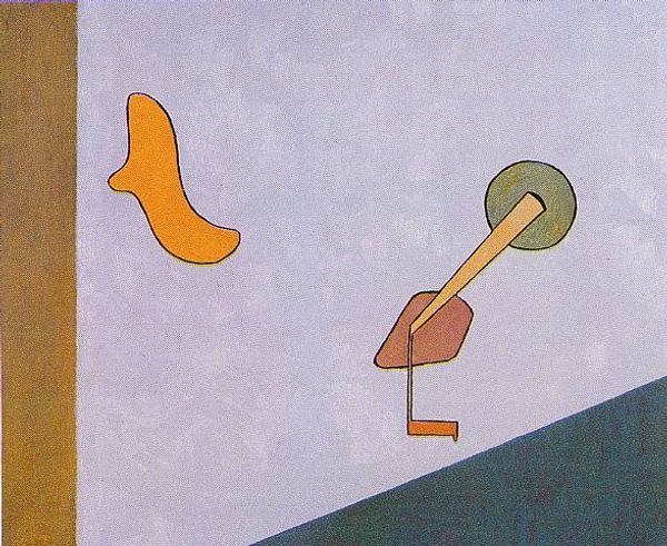 Editor: Here we have Desmond Morris's "The Nest I," created in 1947. It looks like oil on canvas, with very stylized forms. It feels quite unsettling; the figures are bird-like, yet alien. How do you interpret this work from a formalist perspective? Curator: Immediately, the relationships between the shapes command attention. Note the flat planes of colour and the sharp, angular lines defining each figure. The composition dispenses with traditional perspective, creating a flattened space where forms interact on a purely visual level. Editor: So, you're saying it's less about what the "birds" might represent and more about how those shapes relate to each other? Curator: Precisely. The artist is engaging with fundamental formal elements, reducing recognizable forms into abstracted geometric shapes. The title "The Nest" implies organic forms. What is your observation of its visual properties? Editor: The nest shapes echo the triangular forms of the bird. Plus, I see the echoing colour, red and yellow/orange tones, against the pale blue-green. They aren’t realistic colours. Curator: Indeed. The unnatural color palette, divorced from mimetic representation, further underscores Morris’s formal concerns. This choice highlights the artwork's self-referential nature. Did you note the texture? Editor: It does appear smooth and flat, not much impasto at all. Almost like it’s not about the hand of the artist. Curator: A deliberate negation of expressive brushwork; attention focuses instead on the relational dynamism of colour and form. Editor: That gives me a new appreciation for how much Morris can convey just through colour and shape, stripping away other elements. Thank you! Curator: A rewarding exploration, wouldn't you say? There’s always more to learn with visual art.