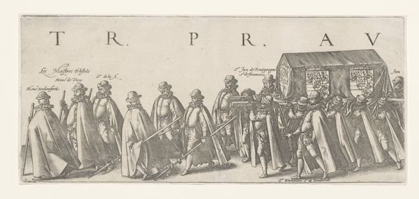 Editor: So, here we have "Begrafenisstoet van Willem van Oranje, blad 3," a print made sometime between 1584 and 1638 by Hendrick Goltzius, currently at the Rijksmuseum. The figures processing seem weighed down, not just by grief, but by something else, an atmosphere, perhaps. What do you see in this piece? Curator: I see the carefully constructed image of power, even in mourning. Consider the context: Willem van Oranje, a pivotal figure in Dutch resistance against Spanish rule, is being honored. But how is that honor being articulated? It’s not just about grief; it's about the continuity of power. Each figure, each emblem, speaks to a very particular societal position. Editor: That makes sense. It's interesting how formalized everything appears. What kind of message does it send? Curator: The formality and detailed representation underscore legitimacy. Line engraving itself, as a medium, speaks to the meticulous effort taken to preserve history and legacy. What seems heavy to you may also speak to the weight of expectation put on those inheriting Willem van Oranje’s legacy. How do you interpret the presence of the horses? Editor: I hadn’t thought of that before. The horses, bearing riders displaying heraldry... They represent nobility and lineage. So even in death, the emphasis is on maintaining a very specific social order and cultural narrative. Curator: Precisely. And understanding that narrative is crucial to interpreting the work. Think about who this print was made for, who was meant to see it, and what they were supposed to take away from it. Editor: I'm now considering how images like this served as propaganda. Curator: Absolutely. Considering this print in its historical and social context illuminates its significance beyond just a historical record, but as an assertion of power, an early kind of identity politics using symbolic tools. Editor: Thank you, I'm seeing so much more depth than I initially realized. It makes me consider how even displays of mourning can reinforce existing power structures.