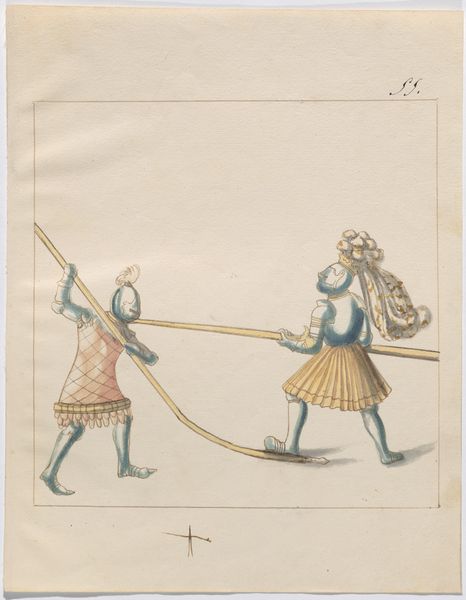 Editor: This is an intriguing watercolor and pencil drawing titled "Foot Combat with Flails," created around 1512-1515, and attributed to an anonymous artist. The muted colors and the focused expressions of the figures make the scene feel both serious and slightly absurd. What stands out to you most when you look at this? Curator: Well, firstly, there's a lovely naiveté here, isn't there? A slightly comical edge to the ferocity. These aren't battle-hardened warriors; they're almost like students of war, earnestly applying textbook moves, perhaps in a practice bout. You know, sometimes I imagine this artist giggling as they sketched, enjoying the performance of combat more than the brutal reality. Does that make sense? Editor: Yes, definitely! They do seem quite theatrical. Curator: And look at the attention to detail on their armour! Every ridge, every fold meticulously rendered. It tells me that while the artist might be playing with the drama, they also have a deep respect, maybe even a fascination, for the craftsmanship of warfare. Were these martial arts manuals for Italian noblemen? Or pure imagination? Editor: I never thought about the possibility of a performance aspect, which now adds a new dimension. Maybe they’re both! Thank you. Curator: It could be an etude or a caprice about our own personal duels; about finding a moment’s grace and connection in such a strange little world.