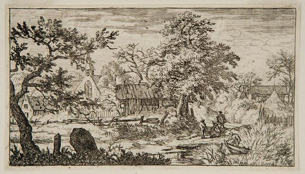 Curator: Allart van Everdingen's etching, "Two Floating Joists," pulls us into a serene, almost forgotten corner of 17th-century life. Editor: It feels like a sketch from a dream, a quick note of a memory—though it speaks of toil. The roughness of the structures almost feels like a deliberate comment. Curator: Indeed, Everdingen seems to be highlighting the labor involved in forestry and lumber at the time. Look at the way he renders the wood—you can almost feel the weight. Editor: The materiality is palpable. It’s not just about floating joists; it's about the whole process. The felling, the transport... the labor to make something like this possible. Curator: And, of course, the figures poling the logs suggest how connected Dutch prosperity was to these resources. Editor: It asks us to consider what is often unseen. I find that quite moving. Curator: Absolutely, there's a poignant quality to that quiet, industrious moment. Editor: A reminder to see the working hands that shape our world.
