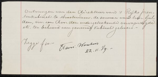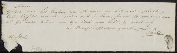 This is Barbara Elisabeth van Houten's calling card to Philip Zilcken, crafted with ink on cardstock. At first glance, the eye is drawn to the elegant script, a dance of thin and thick strokes that fill the upper half of the card. The contrast of the dark ink against the light cardstock creates a stark, immediate visual impact. Consider the semiotics at play here. Beyond its literal message of gratitude, the card operates within a structured system of social exchange. Van Houten uses the formal qualities of handwriting to convey her message. The flourishes and curves of the script are not merely functional; they communicate refinement and attention to detail. The card's structure is also intriguing. The text is deliberately placed, leaving a generous empty space below. This compositional choice subtly reinforces the card's function as a gesture, an acknowledgement that seeks to build a connection. The blank space invites a response, an unspoken dialogue. Ultimately, the artwork offers us a glimpse into a world where communication was carefully mediated through materiality and form. The act of writing and the visual qualities of the script combine to create a message that resonates beyond its literal meaning.