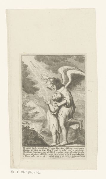 Curator: Pieter Christoffel Wonder's ink drawing on paper, made between 1790 and 1852, presents "Two Angels Carrying a Child Across the Division of Two Worlds Represented as Spheres". The scene feels both tender and deeply symbolic. Editor: There's a somber mood hanging in the air, isn’t there? The monochromatic palette and flowing lines add to the work’s dramatic and ethereal qualities. Curator: Absolutely. Wonder, working in a period marked by social upheaval and philosophical shifts, often imbues his allegorical images with deeper meaning, addressing societal structures of family, care, and mortality. Editor: Note how the two spheres upon which the angels tread aren't seamlessly joined, but separated. It's like they are stepping out of a painting within the painting. Could Wonder be referencing the societal rifts he saw happening during that era? Curator: Precisely. The separation, represented by these divided worlds, might signify a moment of profound change. The child, being carried, could symbolize innocence, perhaps hope, being transported between ideologies or life stages. Consider how these beings embody a shifting sensibility in an increasingly secular world. Editor: Semiotically speaking, angels bearing witness to the beginning of a difficult transition—represented by this uncertain movement from one "world" to the next—suggest the potential for guidance and mediation during unstable times. Curator: Exactly! The piece becomes a historical document, an emblem of how Romantic artists reflected societal challenges through visual metaphor. By rendering this, he's allowing us to analyze that change within society and family. Editor: Viewing this work underscores art's function to immortalize important discussions surrounding community. Curator: Wonder invites us to reconsider both past and contemporary themes through the artistic depiction of challenging issues. Editor: The drawing's subtle execution actually heightens the weighty emotions, doesn't it?