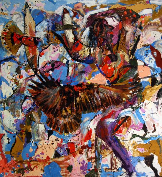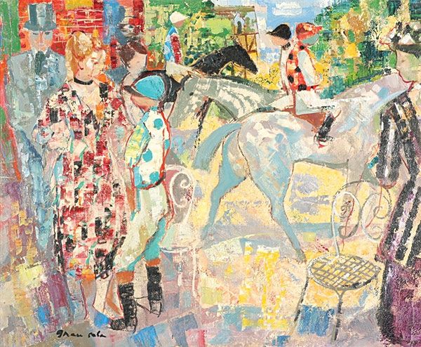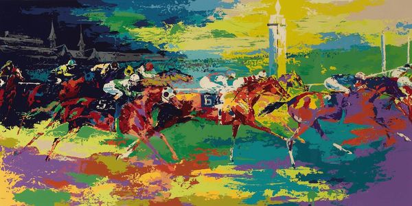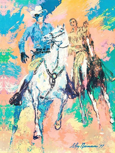 Editor: Here we have LeRoy Neiman's "St. Paul Ramsey County Bicentennial," created with acrylics. The riot of color is just incredible! It’s… festive, I think? The horses above the cityscape almost feel like a dream. What symbols jump out at you? Curator: Those horses, rendered with such vibrant energy, resonate on multiple levels. Horses, throughout history, have represented power, freedom, even nobility. Here, their dynamism evokes the energy and spirit of a bicentennial celebration. Editor: So, more than just horses, but stand-ins for ideas? Curator: Precisely. Look how Neiman juxtaposes them against the cityscape. It is St. Paul itself. But is it merely representational? Note how it dissolves into strokes of blue, almost as if emerging from or returning to a dreamlike state. The years, "1776-1976", float nearby. The canvas acts as a symbolic bridge between a tangible place and abstract time. Editor: I hadn't considered that interplay. It’s like the city's history is this vibrant, living thing rather than a static set of dates. Curator: Exactly! And the vivid color palette – reminiscent of Fauvism – amplifies the emotional impact. Notice the layering. Each stroke adds not just color, but a layer of meaning, contributing to the overall cultural memory. The bicentennial marks both reflection and anticipation of what's to come, much like cultural symbols act as windows into both past and future. Editor: I'm starting to see so many interconnected ideas that are revealed when you decode the visual language here. Thanks for opening my eyes to the deeper symbolism at play. Curator: It is Neiman's distinct gift of encapsulating cultural vibrancy through layered visual language, capturing fleeting emotional resonance in solid, pigmented form.