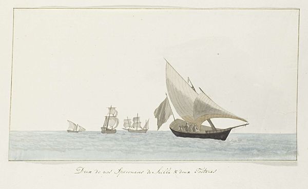 Editor: This watercolor and etching, "Three Ships: Two Speronaras of Scilla and a Tartane," by Louis Ducros, painted in 1778, has a gentle, almost dreamlike quality to it. The colors are so soft and muted. What draws your eye in this piece? Curator: You know, it's the calmness that gets me, too. Almost a pre-storm stillness in the air. Ducros captures a scene, yes, but he also catches a feeling. Look closely, and you can almost smell the sea salt. This work breathes the 18th century—think leisurely travel, exploration, and a kind of detached curiosity about the world. Do you feel that detachment in the almost scientific precision of the rendering? Editor: I do, actually. There's something very observational about it, not romanticized. The way he outlines the ships so precisely… but it’s a landscape too! Curator: Precisely! And the boats themselves tell a story, don’t they? Each vessel, with its particular sail configuration, is almost a portrait. They hint at different origins, different purposes… even different destinations, and perhaps this contrast, these almost clashing ships, give a quiet harmony to the work as a whole? Editor: It does make me wonder about the stories of the people on those boats. They seem so far away. Curator: Exactly! That sense of distance is so key to understanding the work. The Baroque style peaking through here almost places us as privileged onlookers of some distant landscape. Perhaps Ducros means us to remember a past, that seems far away? Maybe the same can be said about our relationship with art and nature these days. Editor: That’s really thought-provoking. I hadn’t considered that aspect. It feels more complex now. Curator: Wonderful, isn't it? An unassuming watercolor pulling us into such depths! I find the painting rather meditative and an astute, silent commentary about a fading time. What do you think now? Editor: Definitely, seeing the history and stillness changes everything. I'm seeing so much more.