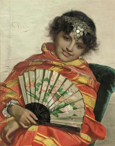 Eugen von Blaas painted “A Young Lady with a Red Fan” with oil on canvas, though the exact date and location remain unknown. This image encapsulates 19th-century European society, particularly its views on women and their roles. The young lady’s attire and adornments—the delicate shawl, the floral bodice, the jewelry—speak to a certain level of social standing and the importance placed on appearances. The red fan itself might be seen as a symbol of coquetry and the art of flirtation, common themes in the art of the period. Blaas was known for his depictions of Venetian life, and this painting, while not explicitly set in Venice, evokes the romanticism and idealized beauty associated with the city. The painting doesn't directly critique societal norms, it does capture the aesthetic and cultural values of its time. Understanding such artwork requires looking into the social history of 19th-century Europe, examining fashion trends, gender roles, and the art market of the time. By consulting historical archives, fashion plates, and exhibition records, we can better understand the social conditions that shaped its production.