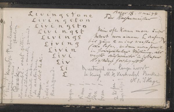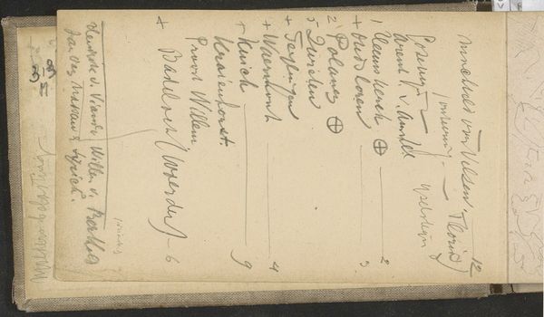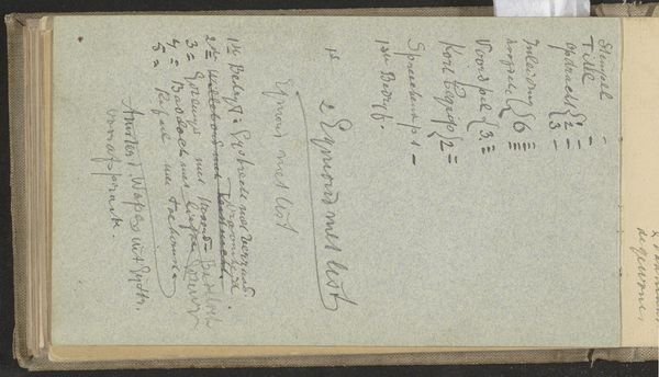 This drawing, "Wolken," was made by Johannes Tavenraat in 1876. It presents us with a page filled with handwriting and sketches. The composition is divided, with textual notes occupying much of the space and simple line drawings positioned along the bottom. The drawing's structure prompts us to consider the relationship between text and image, documentation and artistic expression. Tavenraat's notes create a framework of language around the visual sketches, yet the sketches themselves remain independent, evoking a sense of open space and atmospheric depth. Here we see a disruption of traditional artistic categories. Tavenraat engages with observation, notation, and representation blurring the boundaries between scientific record and aesthetic rendering. The formal qualities of line, composition, and the interplay between text and image, challenge us to reconsider how we assign meaning to both art and the world around us.