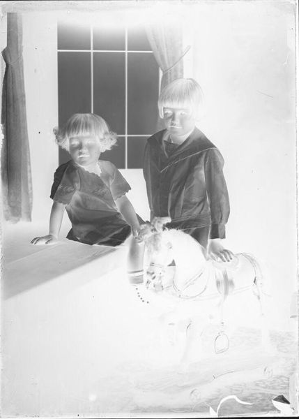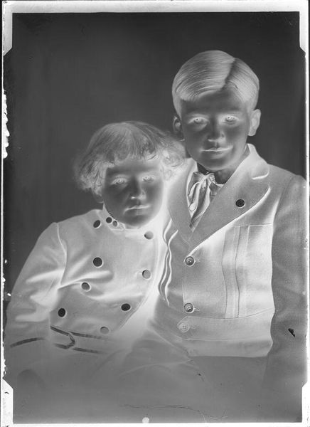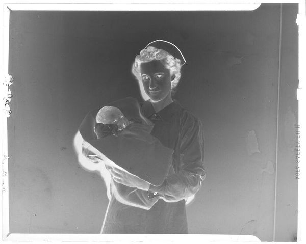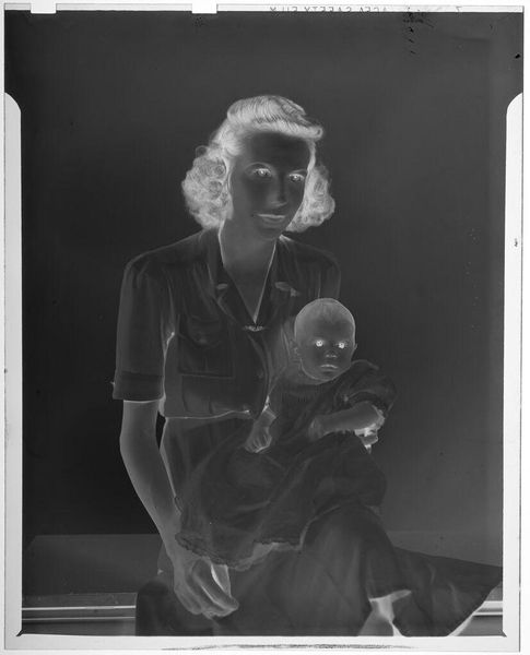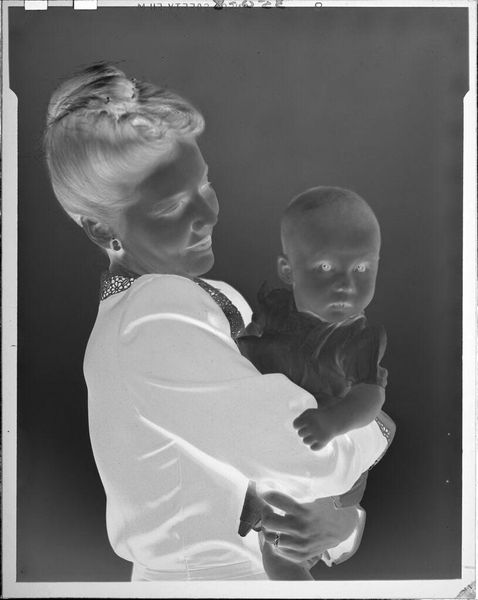 Curator: This is an untitled photograph by John Deusing, simply called "mother and baby". Editor: It's ghostly, almost like a memory surfacing. The inverted tones give it an otherworldly feel, don't you think? Curator: Absolutely, and it's fascinating how universal the Madonna and Child motif is – here, it feels both intimate and strangely detached. The stark contrast emphasizes the protective gesture of the mother. Editor: And the baby's gaze, so direct! It cuts through the visual noise, grounding the piece in raw human connection. It’s like looking into the eyes of generations past and present. Curator: It's a tender moment captured in an unusual way, leaving us to ponder the eternal bond. Editor: Yes, a visual poem, fleeting and resonant.