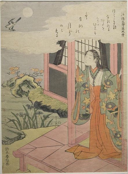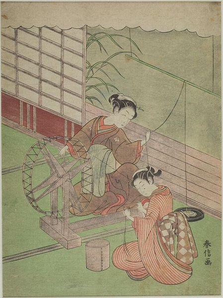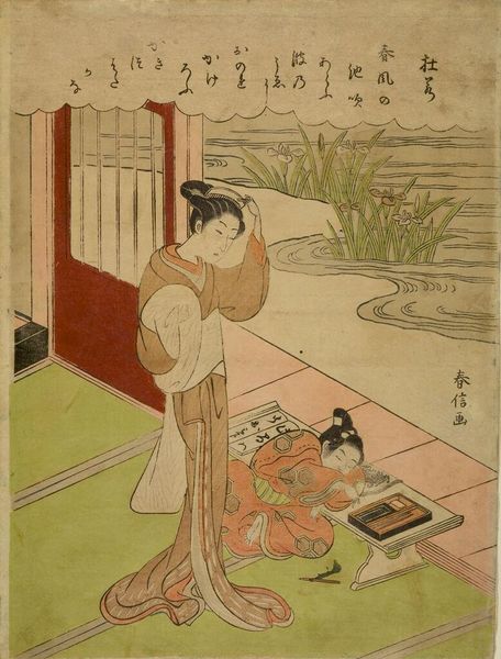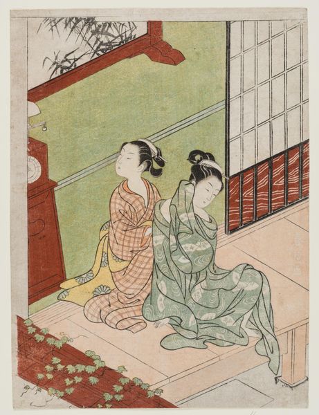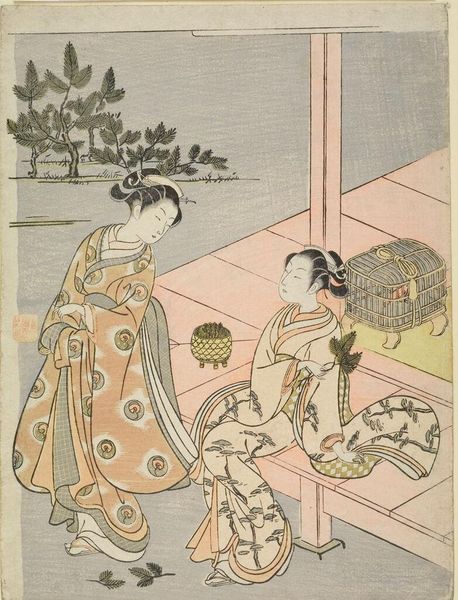Editor: This woodblock print is called "ONAKATSUKASA YORIMOTO ASON" by Suzuki Harunobu. The soft colors and delicate lines create such a calm, almost melancholic, atmosphere. What strikes you most about its composition? Curator: The visual organization hinges upon a sophisticated interplay of geometric forms. Note how the rectilinear structure of the veranda roof contrasts with the organic curves of the figures and the chrysanthemums. Consider the spatial relationships, as well: the foreground grid draws the eye, only to be released into the implied depth of the scene. Editor: So, the tension between the geometric and the organic creates the aesthetic interest? Curator: Precisely. And observe how the artist employs color not for mimetic representation, but for its structural properties. The muted palette unifies the composition, while subtle variations delineate form and space. Editor: I never would have thought about the grid as a tool to create depth. I’ll definitely look at prints differently now.